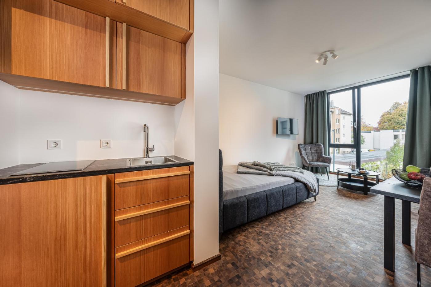 One-Bedroom Apartment. Boasting a private entrance, this apartment comes with 1 bedroom and 1 bathroom with a walk-in shower. Meals can be prepared in the well-fitted kitchenette, which features a stovetop, a refrigerator and kitchenware. The apartment has parquet floors, a seating area with a flat-screen TV, a wardrobe, heating as well as ancourtyard view. The unit has 1 bed.