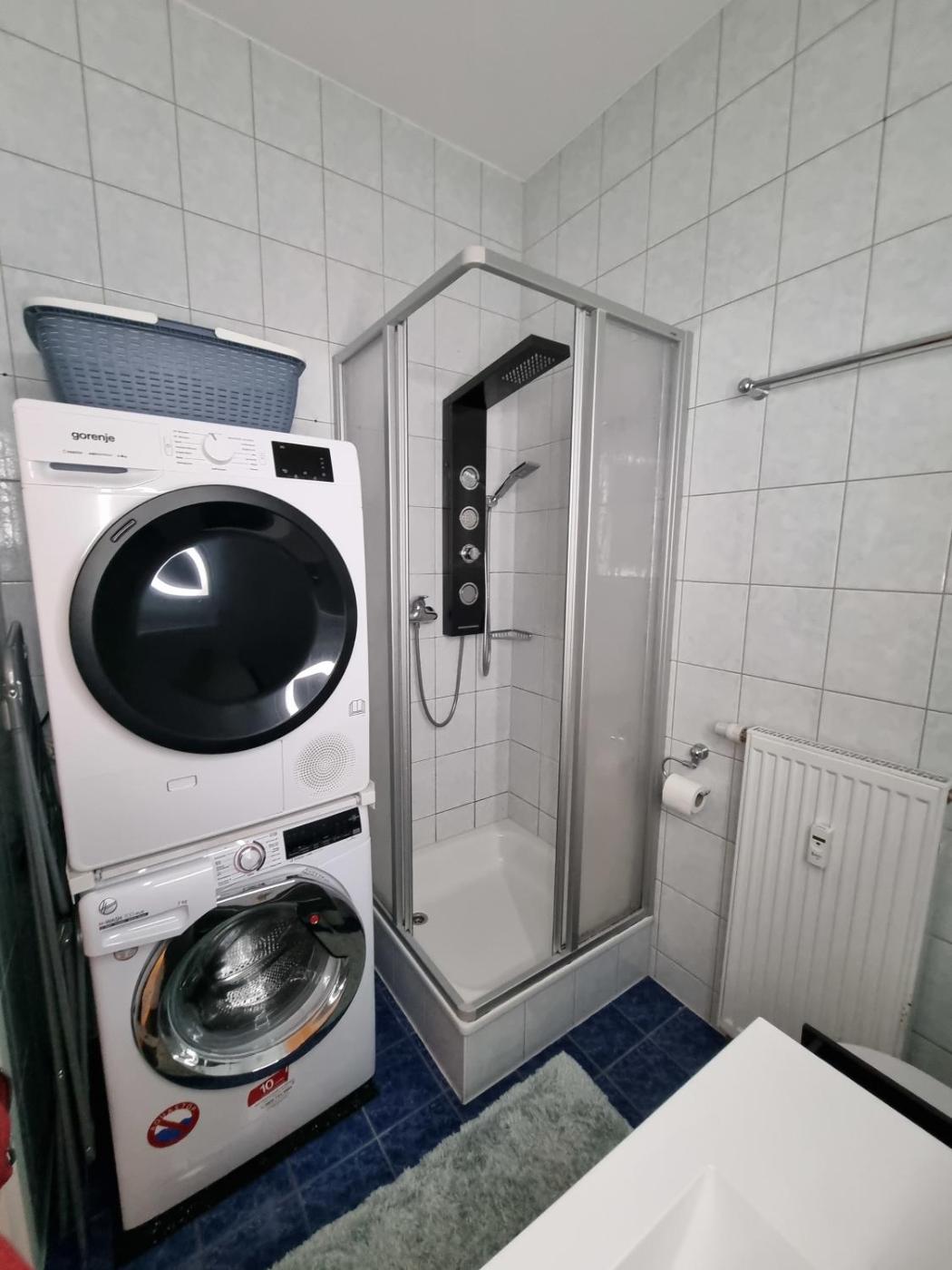 Apartment. This apartment is comprised of 1 living room, 1 separate bedroom and 1 bathroom with a shower and a hairdryer. The fully equipped kitchen features a stovetop, a refrigerator, an oven and a microwave. The apartment offers a washing machine, a coffee machine, tumble dryer, heating, as well as a flat-screen TV. The unit offers 2 beds.