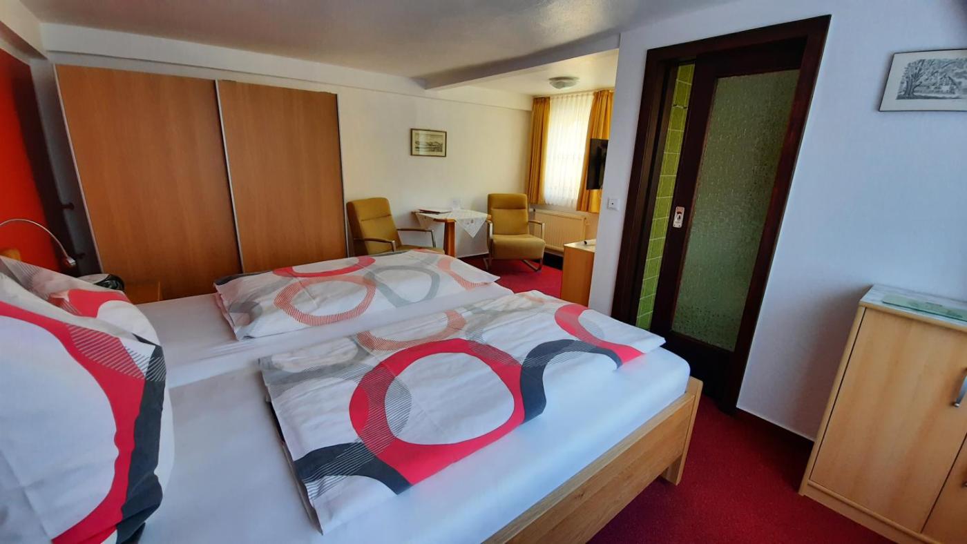 Double Room. Homelike room features a private bathroom, satellite TV and views of the courtyard and Harz Mountains. ;