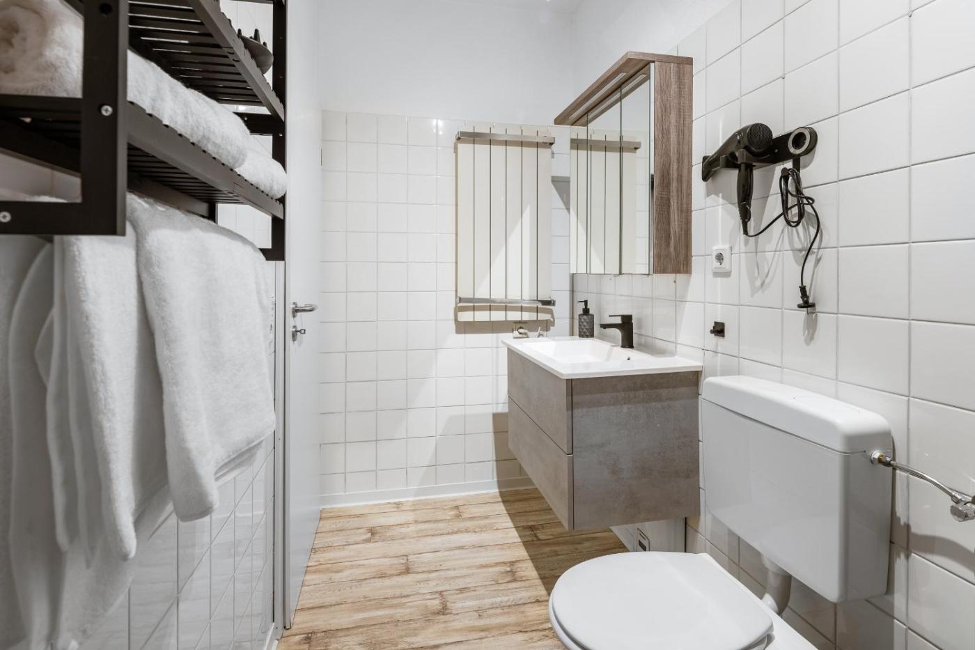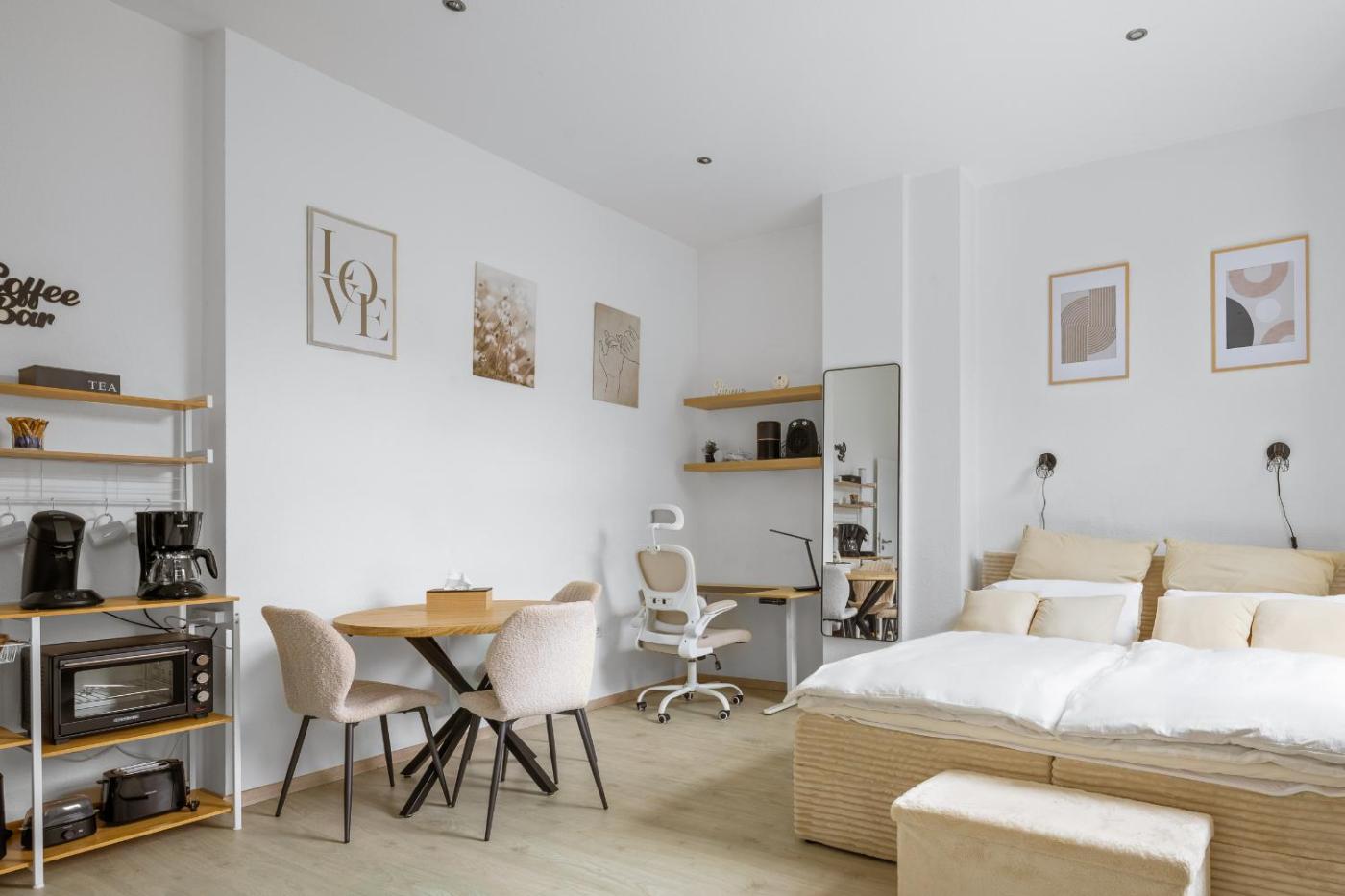 One-Bedroom Apartment. This apartment comes with 1 living room, 1 separate bedroom and 1 bathroom with a shower and a hairdryer. Guests can make meals in the kitchenette that features a stovetop, a refrigerator, kitchenware and an oven. The apartment features a washing machine, soundproof walls, a minibar, a tea and coffee maker and a flat-screen TV with streaming services. The unit has 2 beds.
