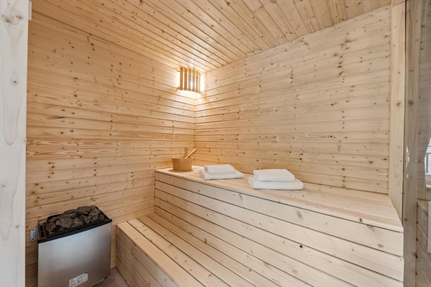 Two-Bedroom Deluxe Apartment with Sauna. This apartment features a sauna. The spacious apartment features 2 bedrooms and 2 bathrooms with a shower and free toiletries. Guests can make meals in the kitchen that comes with a stovetop, a refrigerator, a dishwasher and kitchenware. The apartment provides a washing machine, a tea and coffee maker, a seating area, a safe deposit box, as well as a TV with satellite channels. The unit offers 2 beds. ;