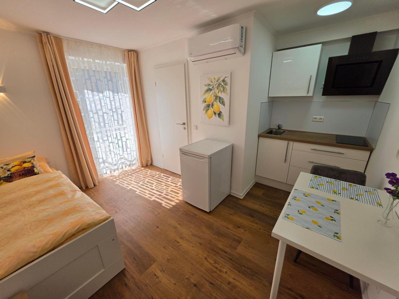 Studio Apartment with Balcony. The air-conditioned apartment features 1 bedroom and 1 bathroom with a shower and a hairdryer. The well-equipped kitchenette has a stovetop, a refrigerator, kitchenware and a toaster. Featuring a terrace, this apartment also offers a washing machine, a coffee machine and a flat-screen TV with satellite channels. The unit offers 1 bed. ;
