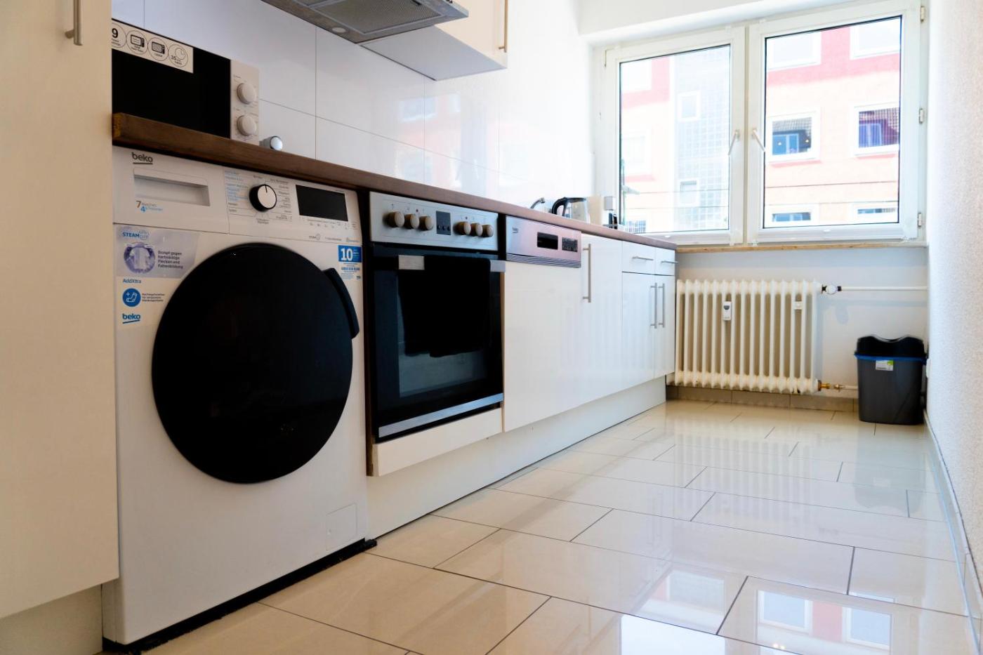 Two-Room Apartment. The apartment has 1 bedroom and 1 bathroom with a shower and free toiletries. Meals can be prepared in the well-fitted kitchen, which has a stovetop, a refrigerator, kitchenware and a microwave. The apartment offers a washing machine, a tea and coffee maker, a dining area, a wardrobe and a flat-screen TV. The unit has 2 beds.