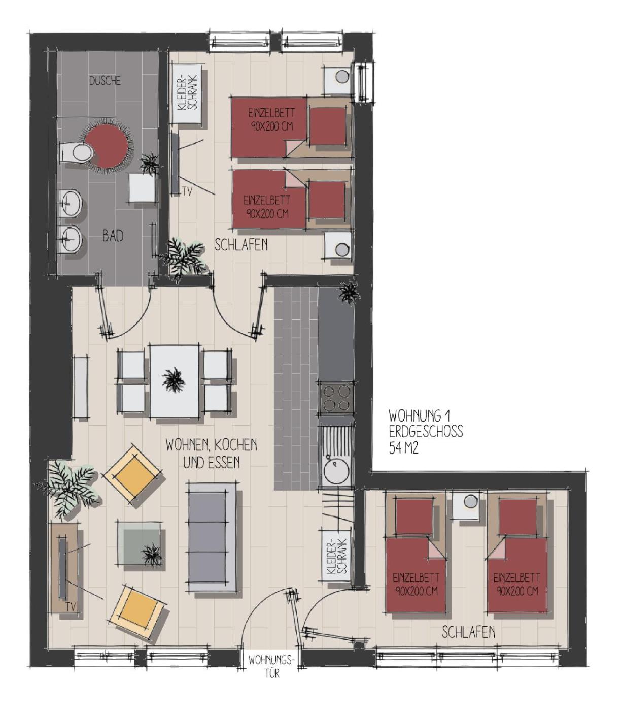 One-Bedroom Apartment. Boasting a private entrance, this apartment also includes 1 bedroom, a seating area and 1 bathroom with a shower and a hairdryer. Meals can be prepared in the well-fitted kitchen, which is fitted with a stovetop, a refrigerator, a dishwasher and kitchenware. The apartment offers a coffee machine, a dining area, a wardrobe, parquet floors and a flat-screen TV. The unit has 2 beds.