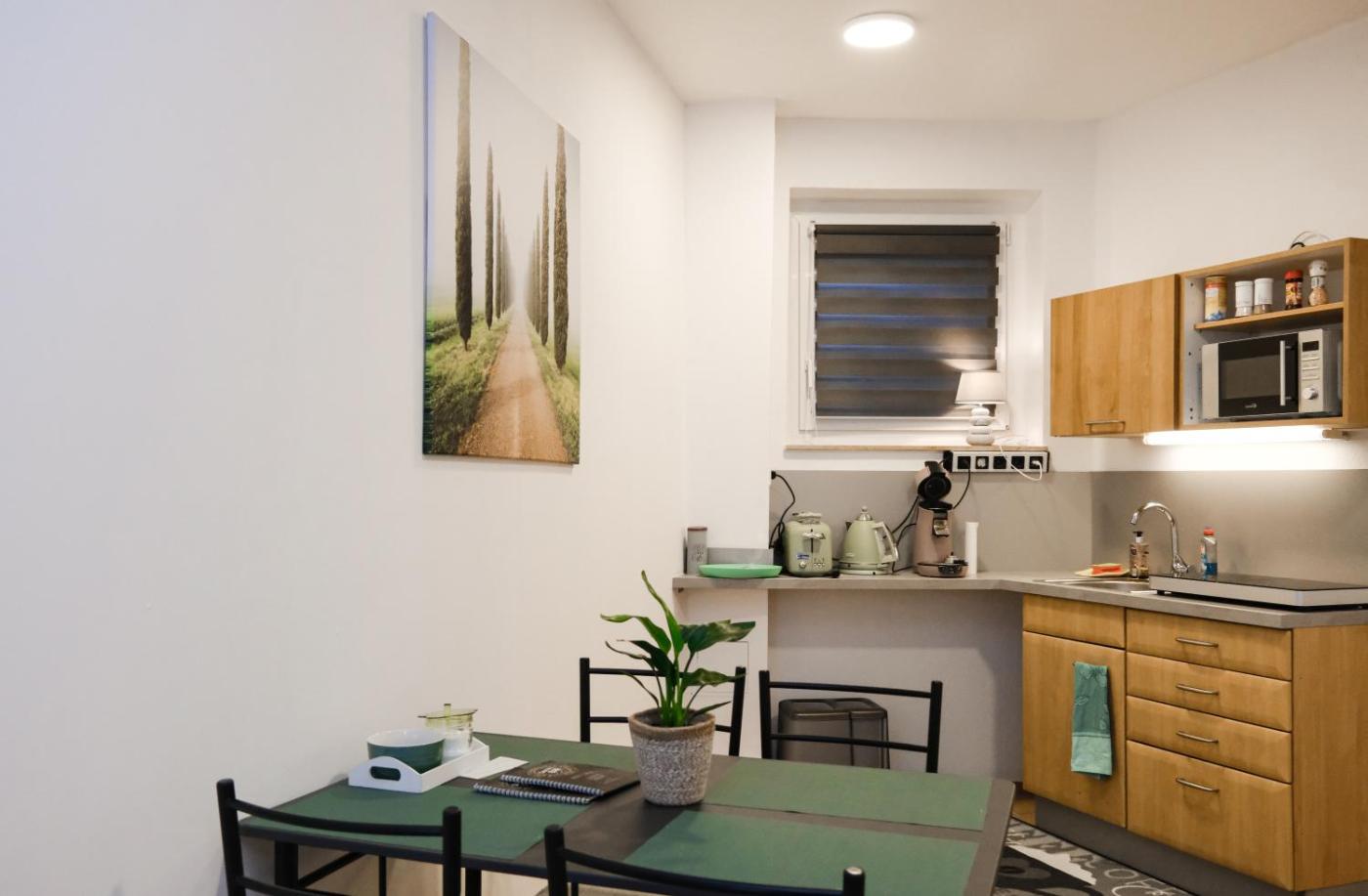 One-Bedroom Apartment. Boasting a private entrance, this apartment also comes with 1 separate bedroom, 1 bathroom with a bath or a shower, a kitchenette and a dining area. In the well-equipped kitchenette, guests will find a stovetop, a refrigerator, a microwave and a toaster. The apartment features a coffee machine, a wardrobe, heating and a flat-screen TV. The unit has 2 beds.