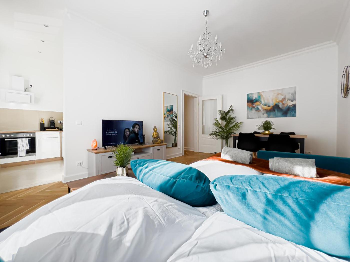 One-Bedroom Apartment. This apartment consists of 1 living room, 1 separate bedroom and 1 bathroom with a shower and free toiletries. The fully equipped kitchen has a stovetop, a refrigerator, kitchenware and an oven. The apartment features parquet floors, a seating area with a flat-screen TV with streaming services, a washing machine, a tea and coffee maker, as well as a dining area. The unit offers 2 beds.
