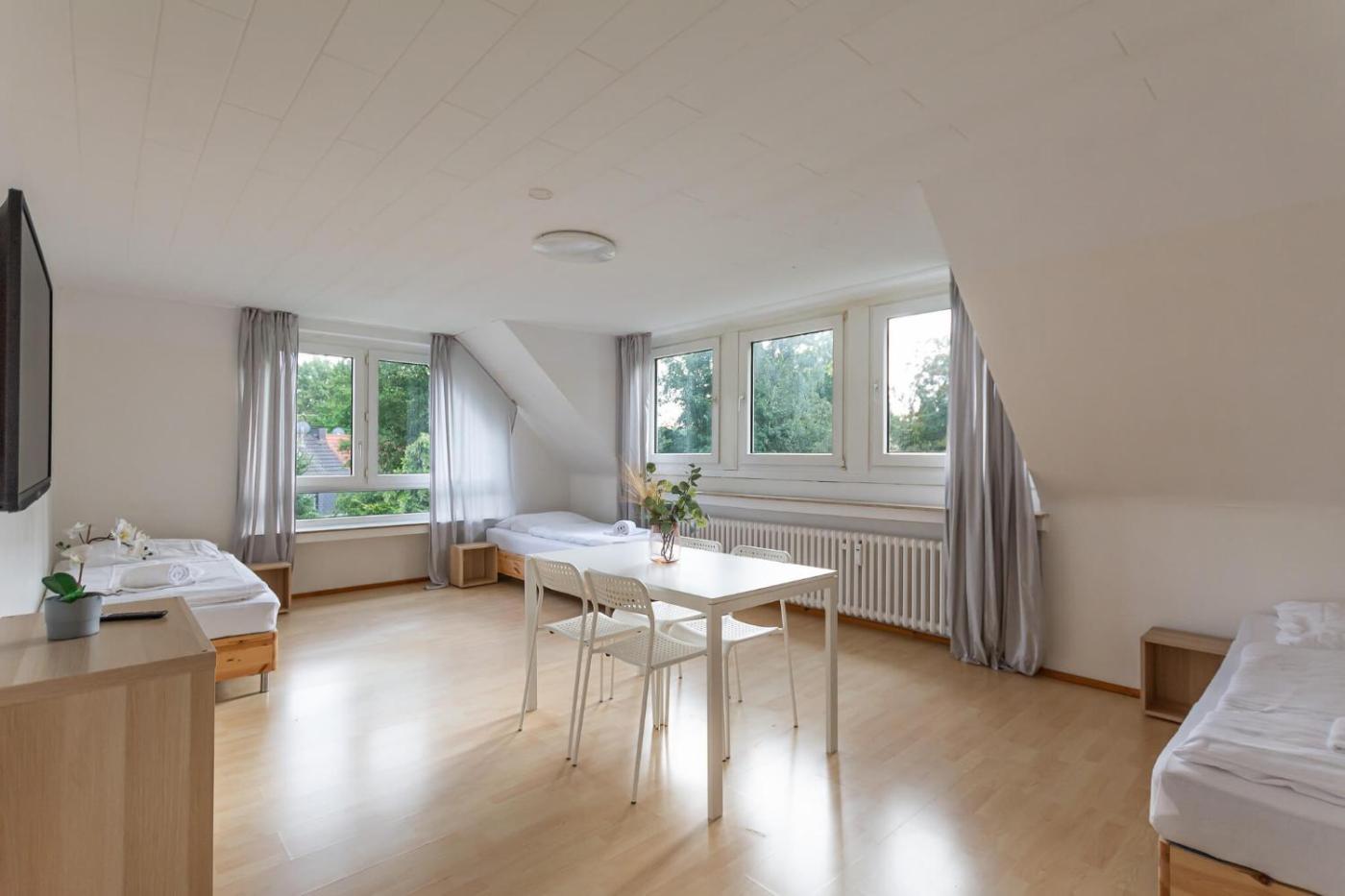 Three-Bedroom Apartment. Featuring a private entrance, this spacious apartment also comprises 3 separate bedrooms and 1 bathroom with a bath. In the well-equipped kitchen, guests will find a stovetop, a refrigerator, a dishwasher and kitchenware. The apartment provides a flat-screen TV with streaming services, a washing machine, a coffee machine, heating as well as ancourtyard view. The unit offers 7 beds.