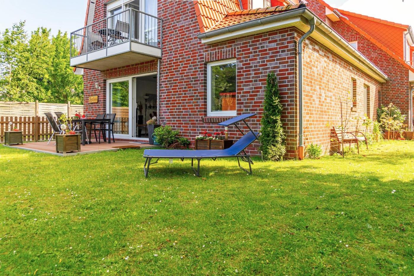 The spacious apartment features 2 bedrooms, a TV, a fully equipped kitchen with a dishwasher and an oven, a washing machine, and 1 bathroom with a bath. Guests can enjoy a meal on an outdoor dining area while overlooking the garden views.