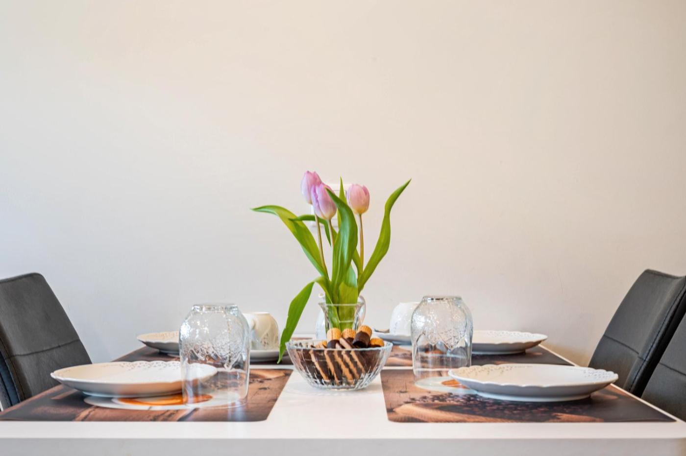 The apartment has 2 bedrooms, a TV with satellite channels, a fully equipped kitchen with a dishwasher and an oven, and 1 bathroom with a shower. Towels and bed linen are available in the apartment.