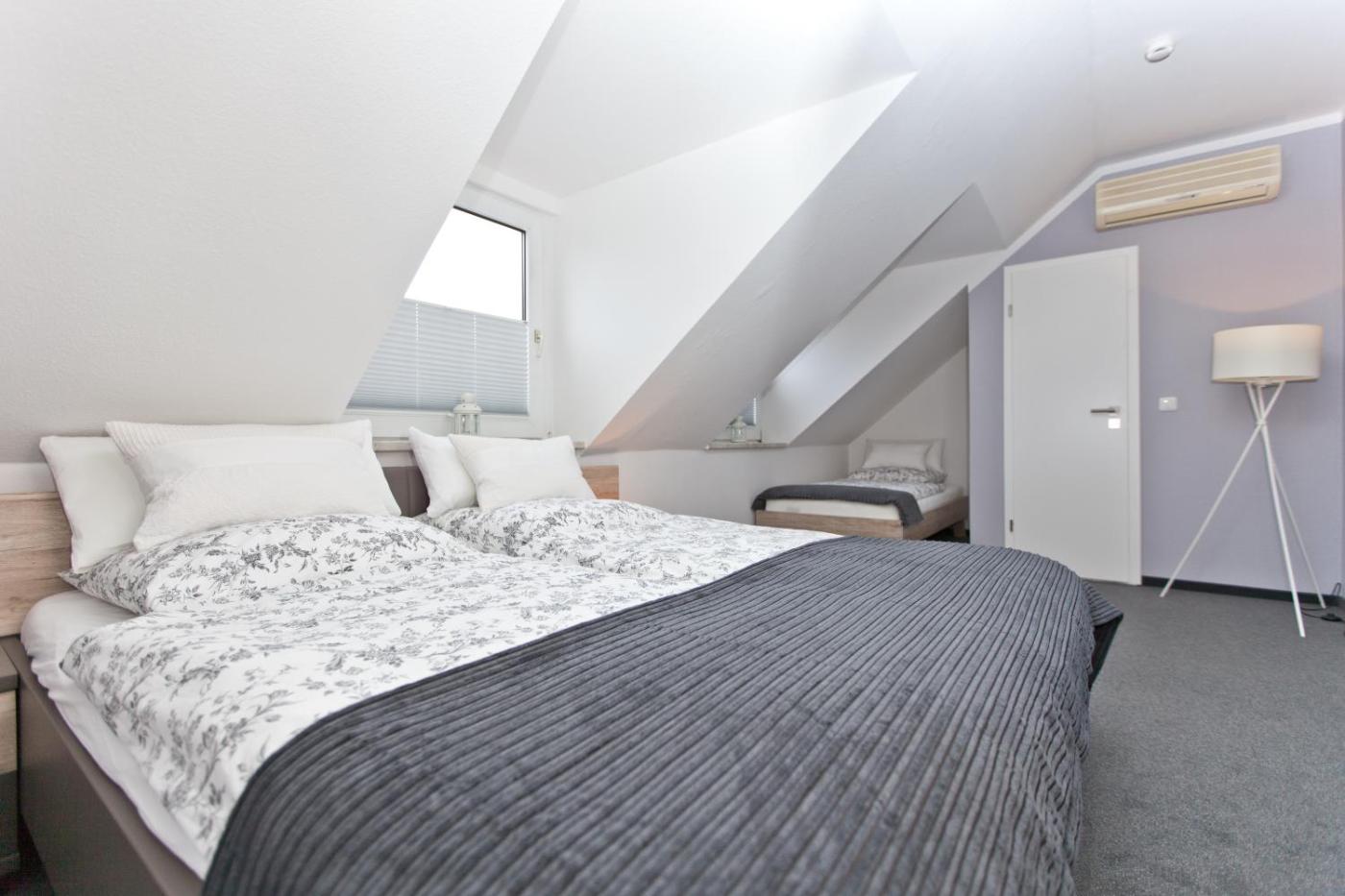 Triple Room with Shower. The triple room provides air conditioning, a seating area, as well as a private bathroom featuring a walk-in shower and a hairdryer. The triple room features a wardrobe, an electric kettle, a carpeted floor, heating and a flat-screen TV with satellite channels. The unit offers 2 beds.