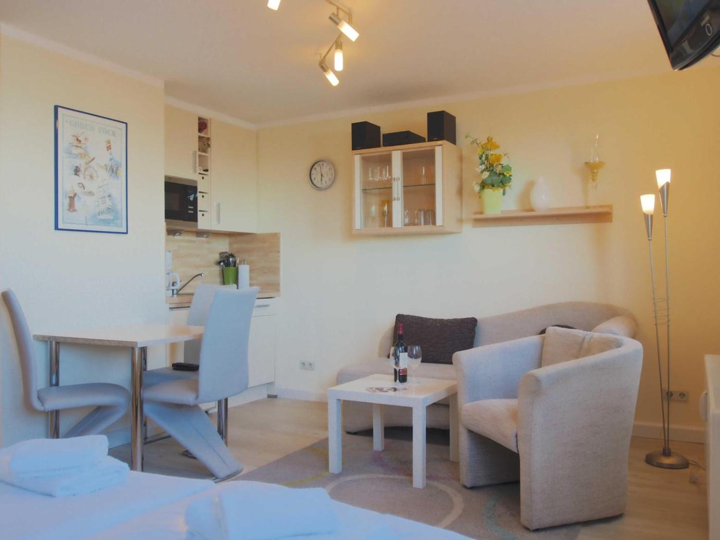 The apartment features a TV and a living room. The kitchen is fitted with a microwave, a toaster and a fridge, as well as coffee machine and kettle.